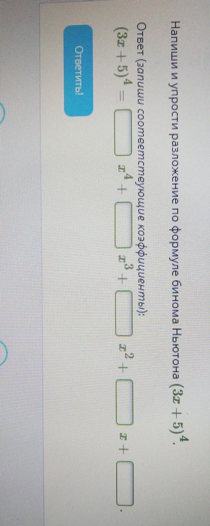 Напиши и упрости разложение по формуле бинома Ньютона (3х +5).