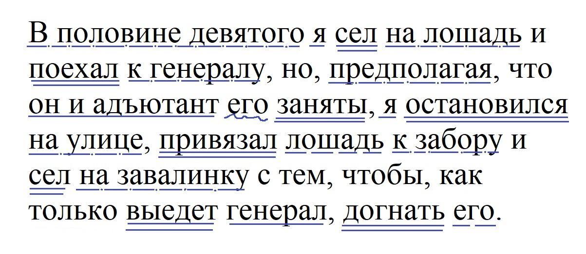 синтаксический разбор 16 баллов вставлять не надо 2) В половине девятого я сел на лошадь и п..ехал к г..н..ралу но пр..дпол..гая что он и ад(ъ,ь)ютант его зан..ты я ост..н..вился на улиц.. пр..в..зал лошадь к забору и сел на завал..нку с тем что(бы) как только выед..т г..н..рал д..гнать его