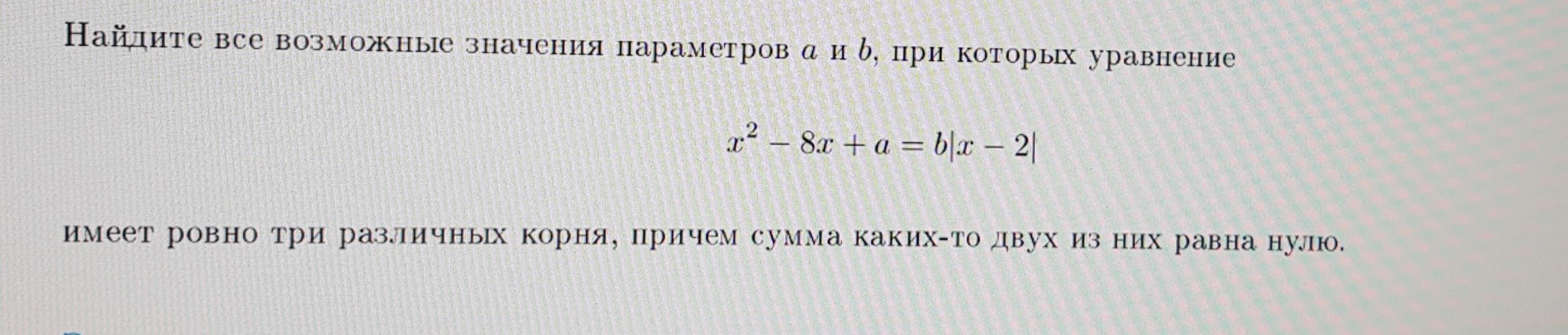 Найдите все возможные значения параметров а и b, при которых уравнение x^2-8x+a=b|x-2| имеет ровно 3 различных корня,причем сумма каких-то двух из них равна нулю.