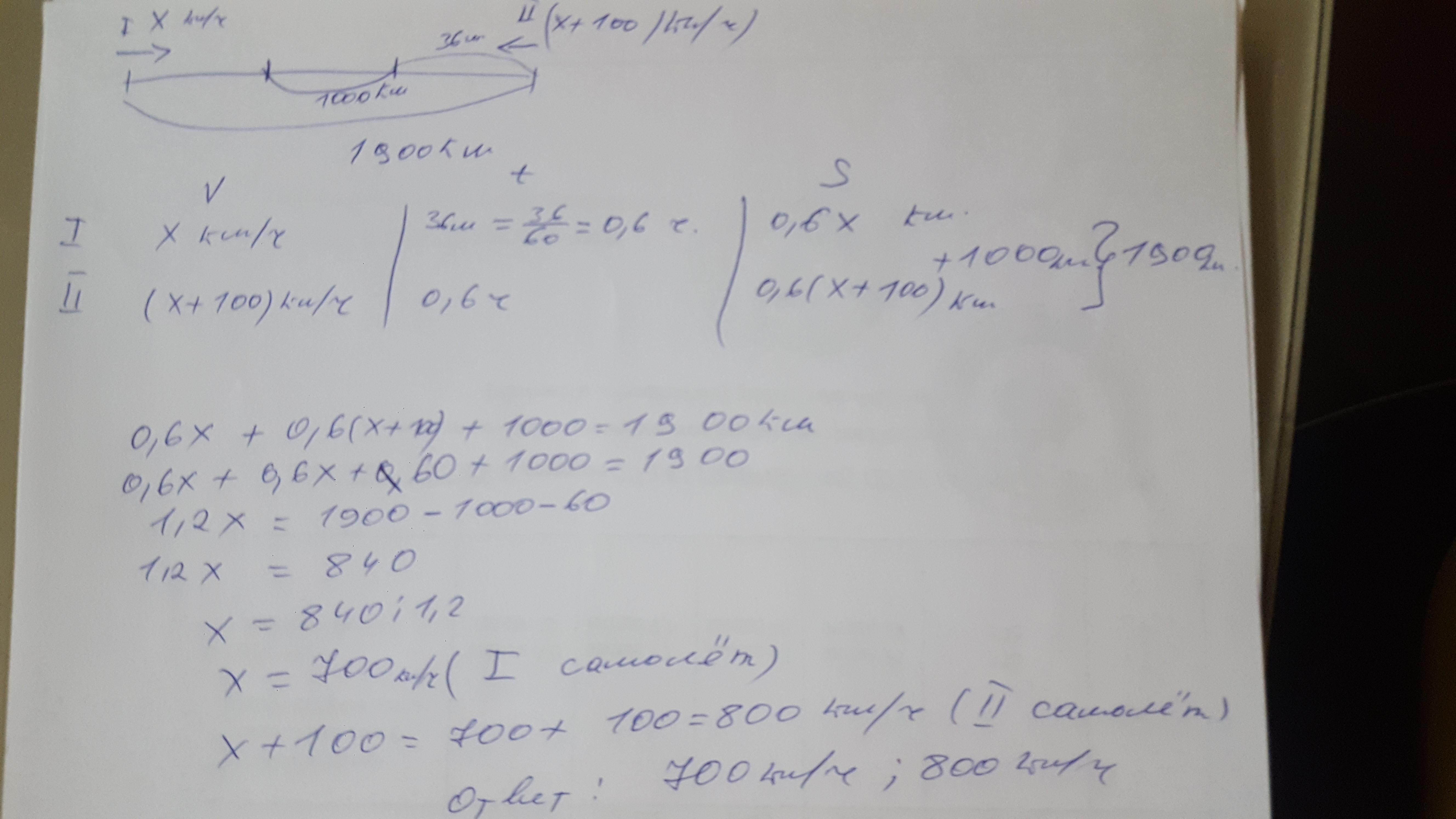 ПОМОГИТЕ ПОЖАЛУЙСТА!!! Из двух аэропортов, расстояние между которыми 1900 км, вылетели одновременно навстречу друг другу два самолета. Через 36 мин им оставалось пролететь до встречи 1000 км. Найдите скорости самолётов, если известно,что скорость одного из них на 100 км/ч больше скорости другого.