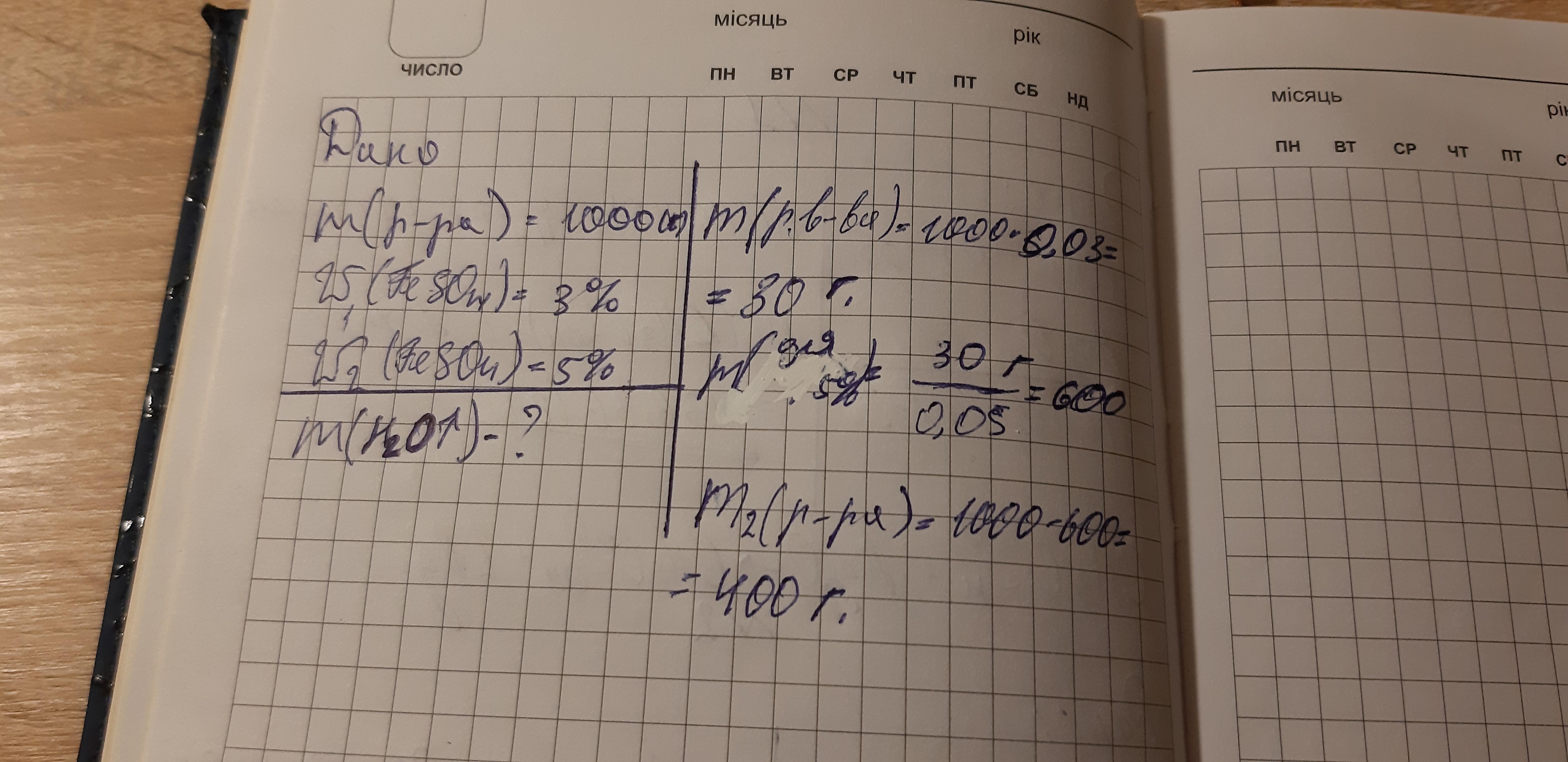 Вычислите массу воды (в граммах), которую надо выпарить из 1 кг 3%-ного раствора сульфата железа(II) для получения 5%-ного раствора. (Запишите число с точностью до целых.)