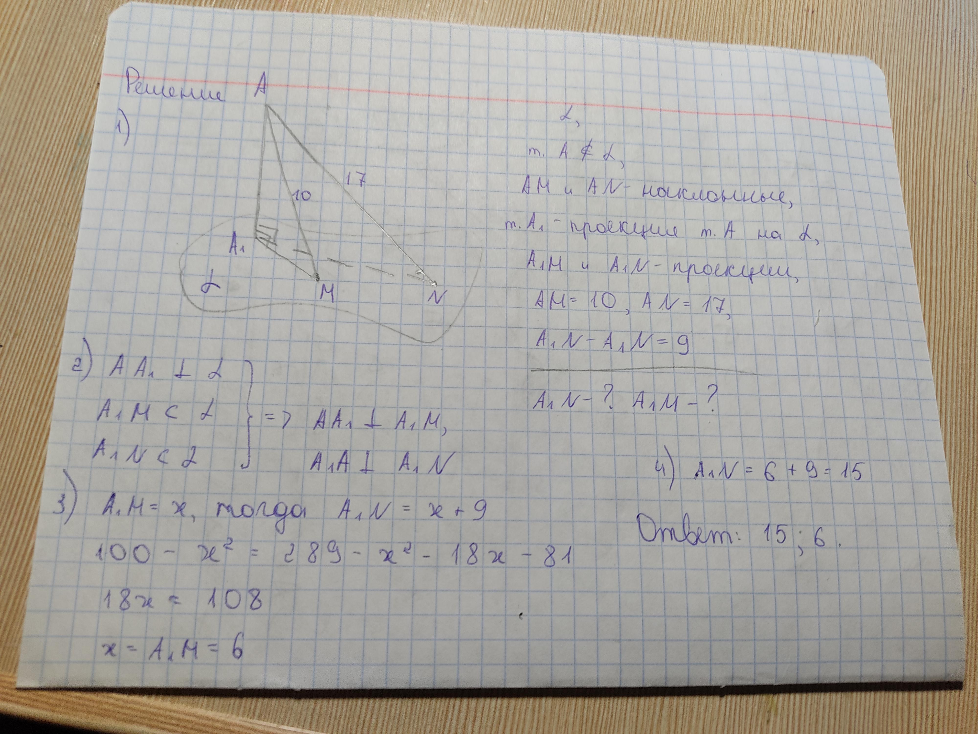 Из точки в плоскости проведены две наклонные, равные 10 и 17. Разность проекций этих наклонных равна 9. Найдите длину проекций