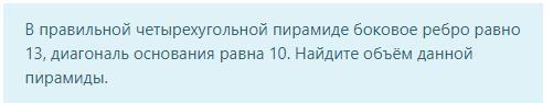 В правильной четырехугольной пирамиде боковое ребро равно 13, диагональ основания равна 10. Найдите объём данной пирамиды.