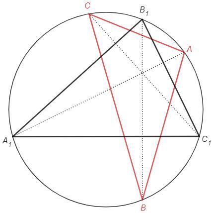 Точка A1 — середина дуги BC описанной окружности треугольника ABC, не содержащей точки A. Аналогично определяются точки B1 и C1. Известны углы треугольника A1B1C1: ∠A1=42∘, ∠B1=74∘, ∠C1=64∘. Чему равны углы треугольника ABC?
