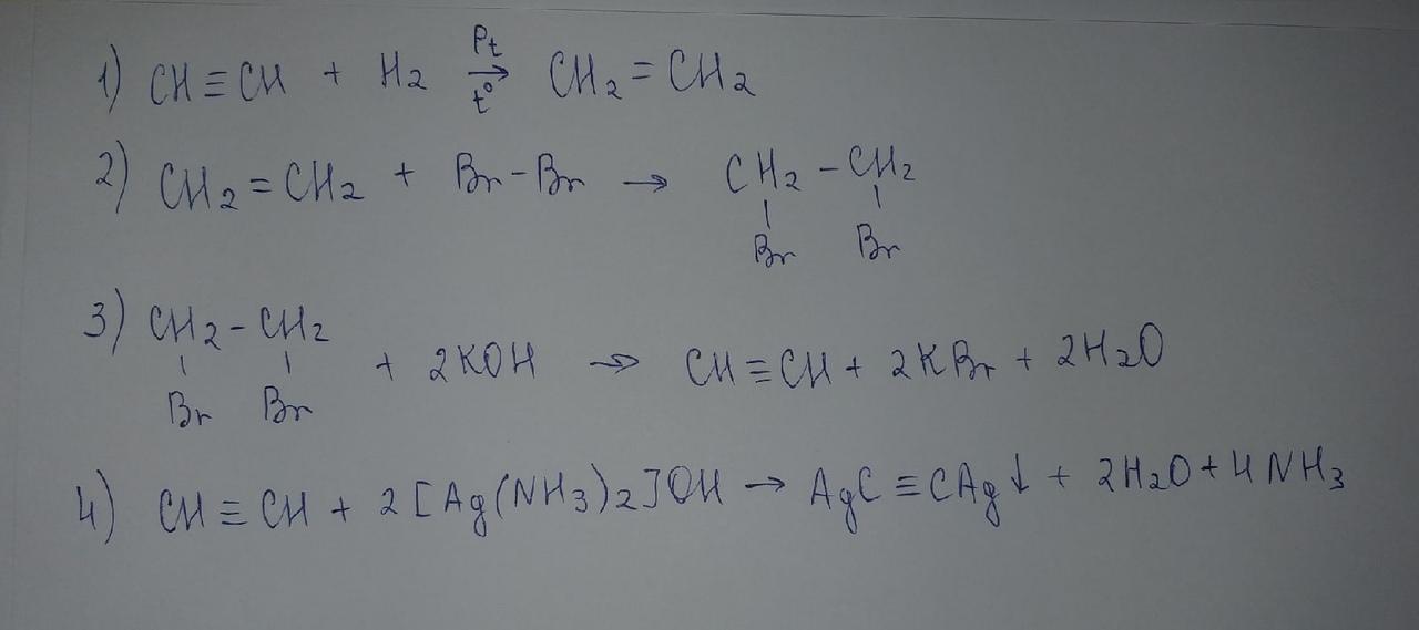3) CH2(Br)-CH2(Br) (Бромэтен) + 2KOH -> CH≡CH (Ацетилен) + 2KBr + 2H2O