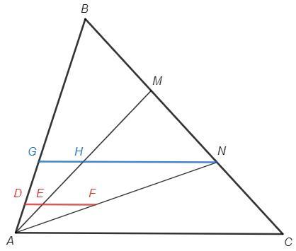 Точки M и N делят сторону BC треугольника ABC на три равные части, причём M лежит ближе к B. Прямая, параллельная стороне AC, пересекает отрезки AB, AM и AN в точках D, E и F соответственно. Найдите отношение DE:EF.