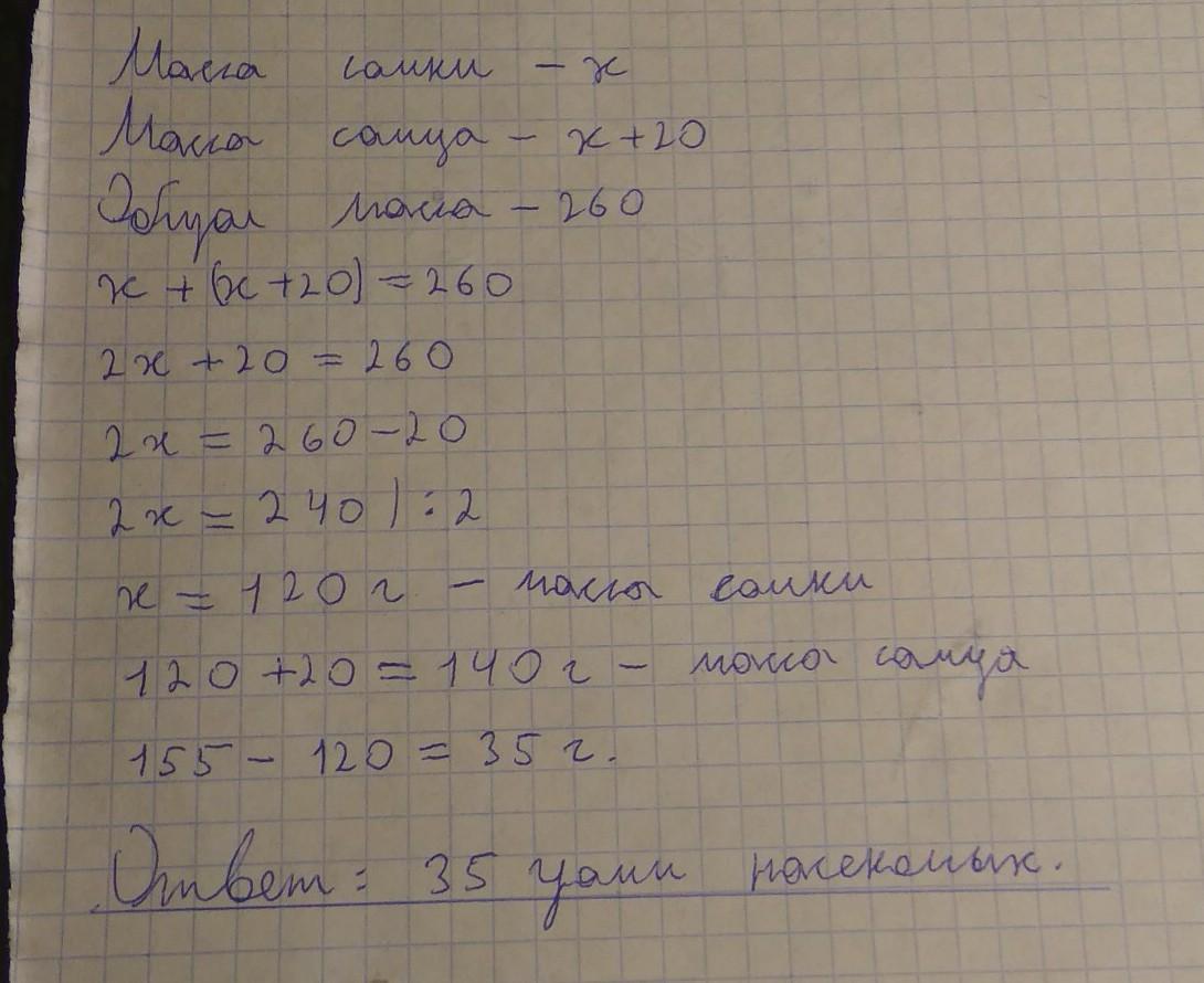 Общая масса самки и самца птиц 260г. Масса самца на 20г больше чем масса самки. Что бы масса самки достигла 155 г сколько г насекомых она должна съесть?