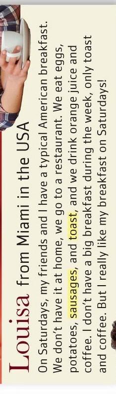 On Saturdays we go to a restaurant and eat potatoes, sausages, and toast, and we usually drink juice or coffee. That my American breakfast. I love it.