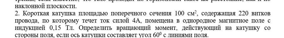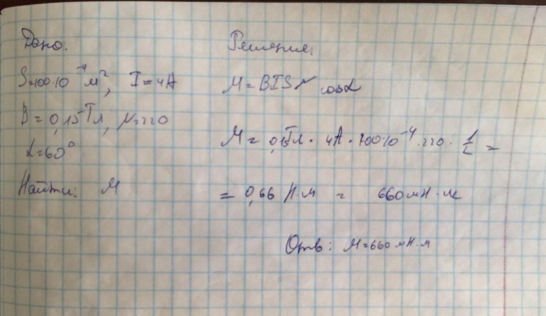 Короткая катушка площадью поперечного сечения 100 см2, содержащая 220 витков провода, по которому течет ток силой 4А, помещена в однородное магнитное поле с индукцией 0,15 Тл. Определить вращающий момент, действующий на катушку со стороны поля, если ось катушки составляет угол 600 с линиями поля.