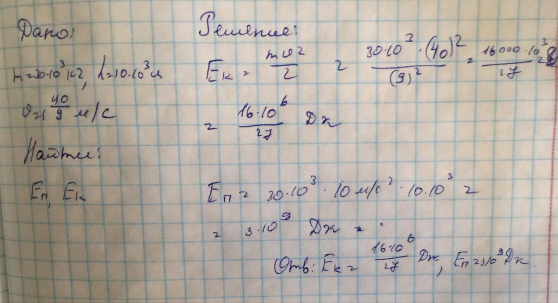 Самолет массой 30 т. Летит на высоте 10 км со скоростью 16 км/ч. Какова кинетическая и потенциальная энергия самолета?