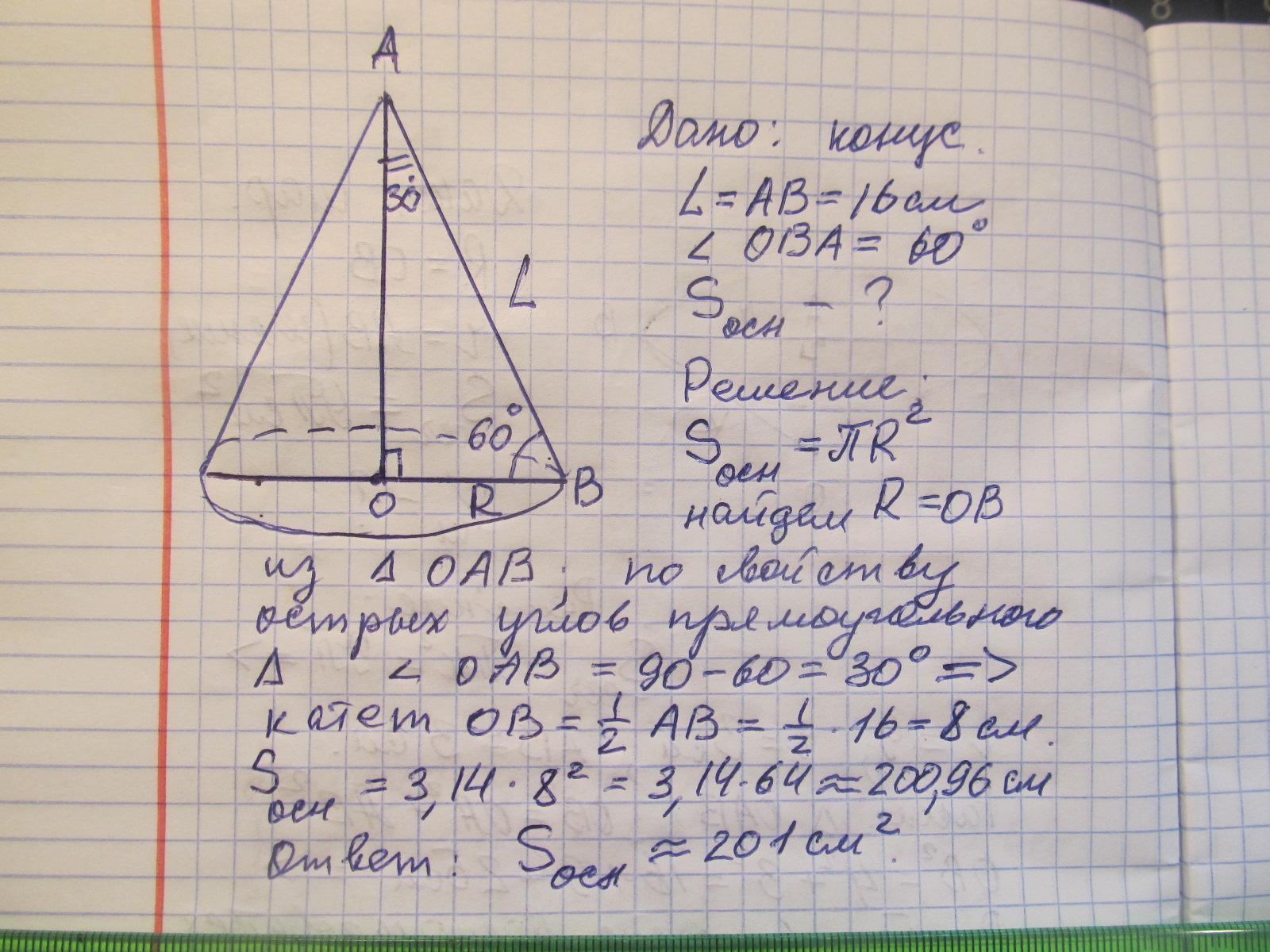 Нарисуем конус. Проведём к основанию из его вершины высоту и получим прямоугольный треугольник. В нём один из острых углов равен 60°, следовательно второй острый угол равен 90°–60° = 30°. Катет, лежащий напротив угла в 30°, равен половине гипотенузы, а гипотенуза 16 см => этот катет (он же радиус окружности, которая является основанием конуса) равен 16/2 = 8 см.