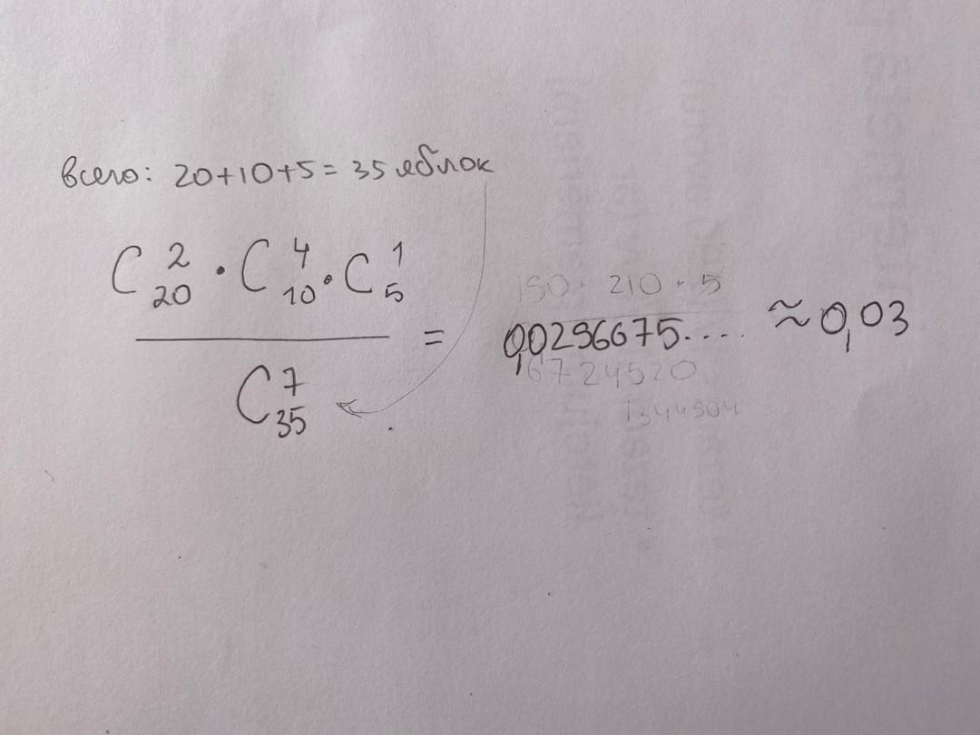 чтобы найти вероятность события, нужно поделить число благоприятных исходов ( в данном случае- 2 червоних, 4 жовтих і 1 зелене) на общее число исходов ( из всех яблок выбираем любые 7)