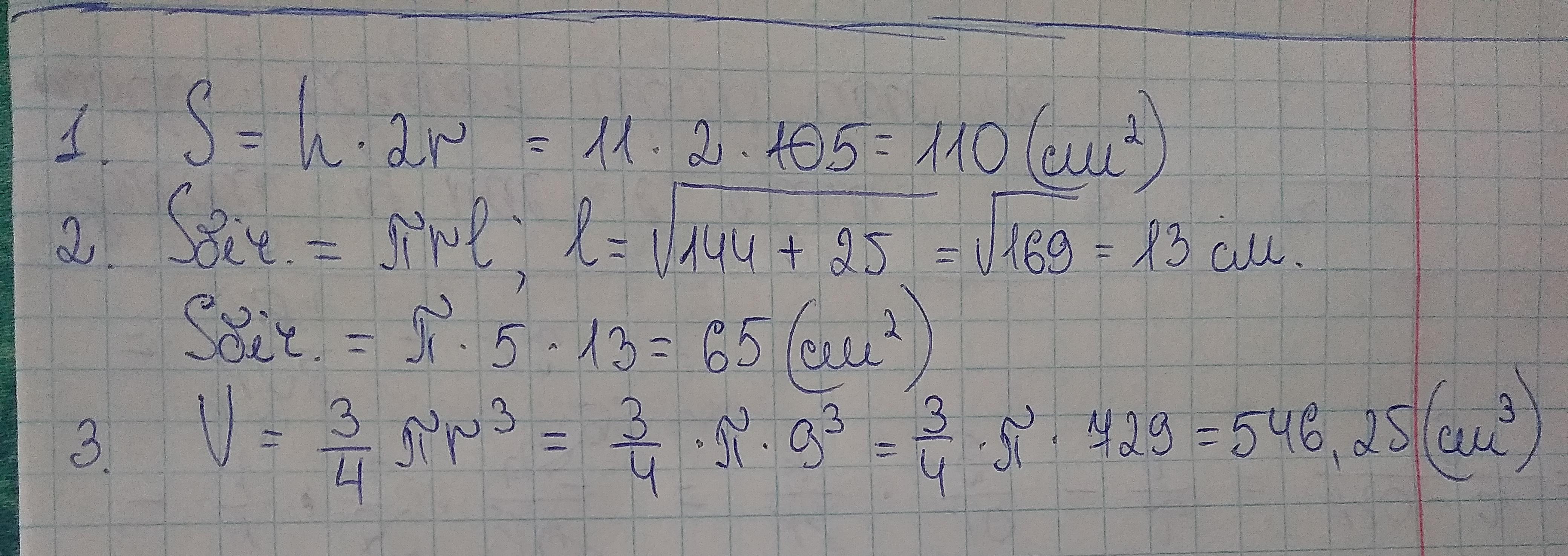 1.Чему равна площадь осевого сечения цилиндра, если радиус его равен 5 см, а высота 11 см? 2. Прямоугольный треугольник с катетами 5 и 12 вращается вокруг большего катета. Вычислите площадь боковой поверхности полученного тела вращения. 3.Вычислить объем шара, радиус которого равен 9. ПОМОГИТЕ ПОЖАЛУЙСТА ЭТО ОЧЕНЬ СРОЧНО<3