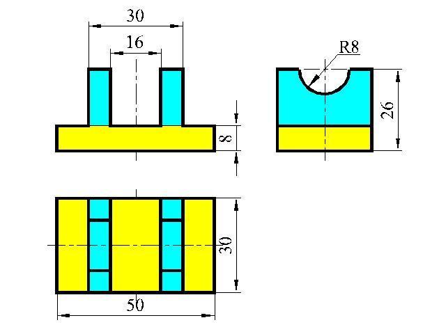 Стойка (голубого цвета) - прямоугольный параллелепипед с размерами: 30 мм - длина, 26-8 = 18 мм - высота, (30-16):2 = 7 мм - толщина, имеющая выемку - полукруг радиусом 8 мм.