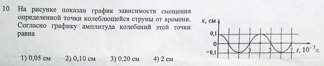 Помогите пожалуйста. На рисунке показан график зависимости смещения определенной точки колеблющейся струны от времени. Согласно графику амплитуда колебаний точки равна: 1)0,05 см 2)0,10 см 3)0,20 см 4)2 см