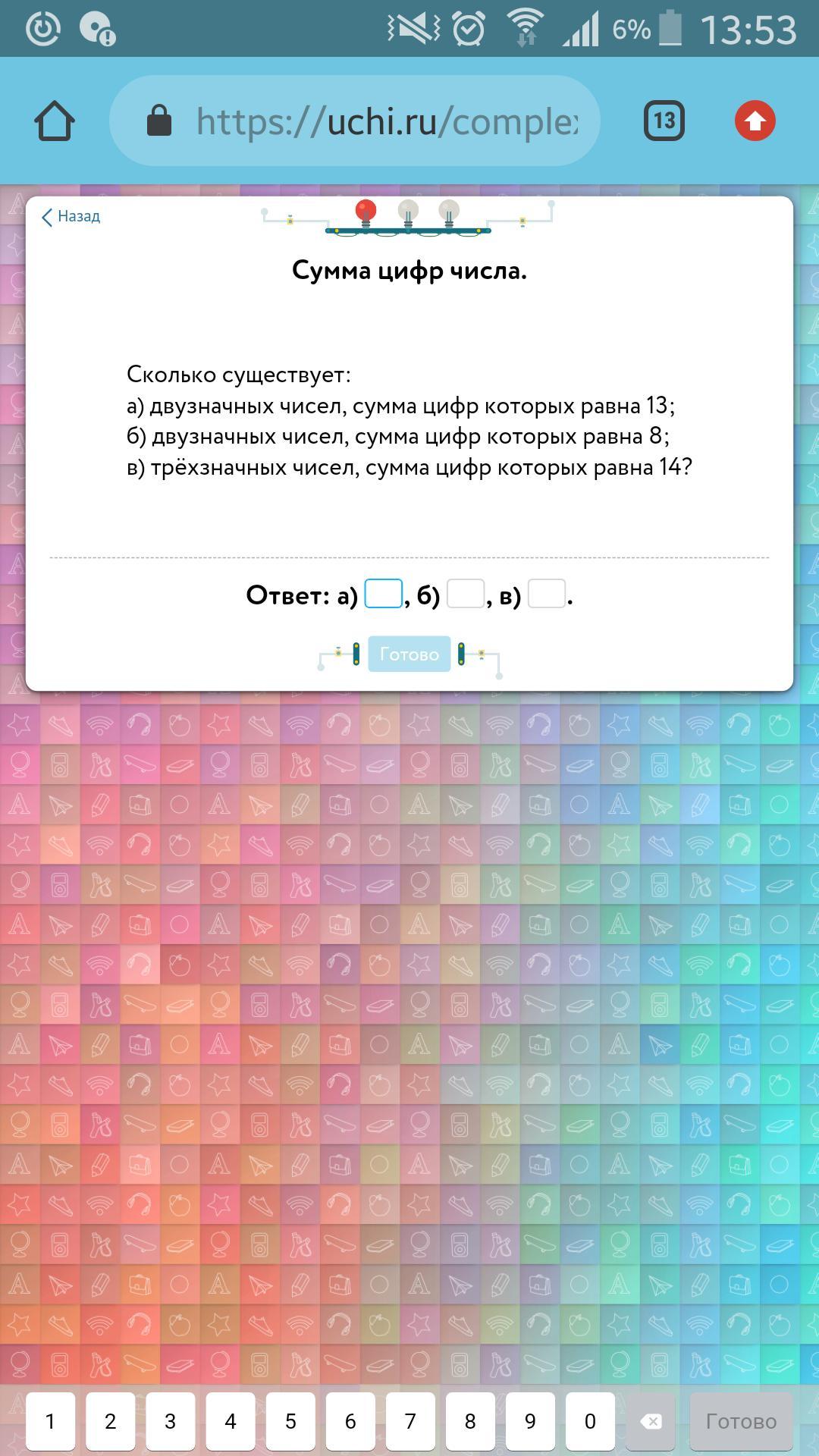 б) 1 и 7, 2 и 6, 3 и 5, 4 и 4, 5 и 3, 6 и 2, 7 и 1, 8 и 0.