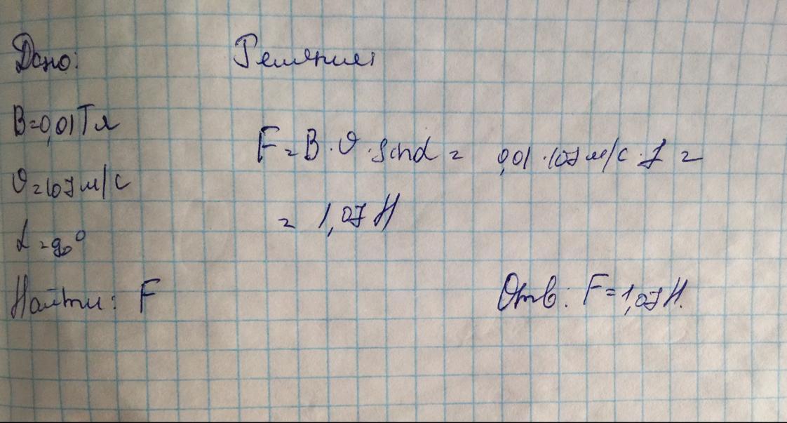 Электрон движется в однородном магнитном поле, индукция которого равна 0, 01 Тл. Скорость электрона равна 107 м/с. Вектор скорости электрона направлен перпендикулярно линиям индукции. Чему равна сила, действующая на электрон?