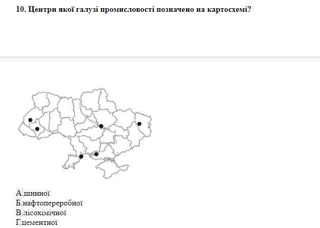 Центри якої галузі промисловості позначено на картосхемі? А.шинної Б.нафтопереробної В.лісохімічної Г.цементної