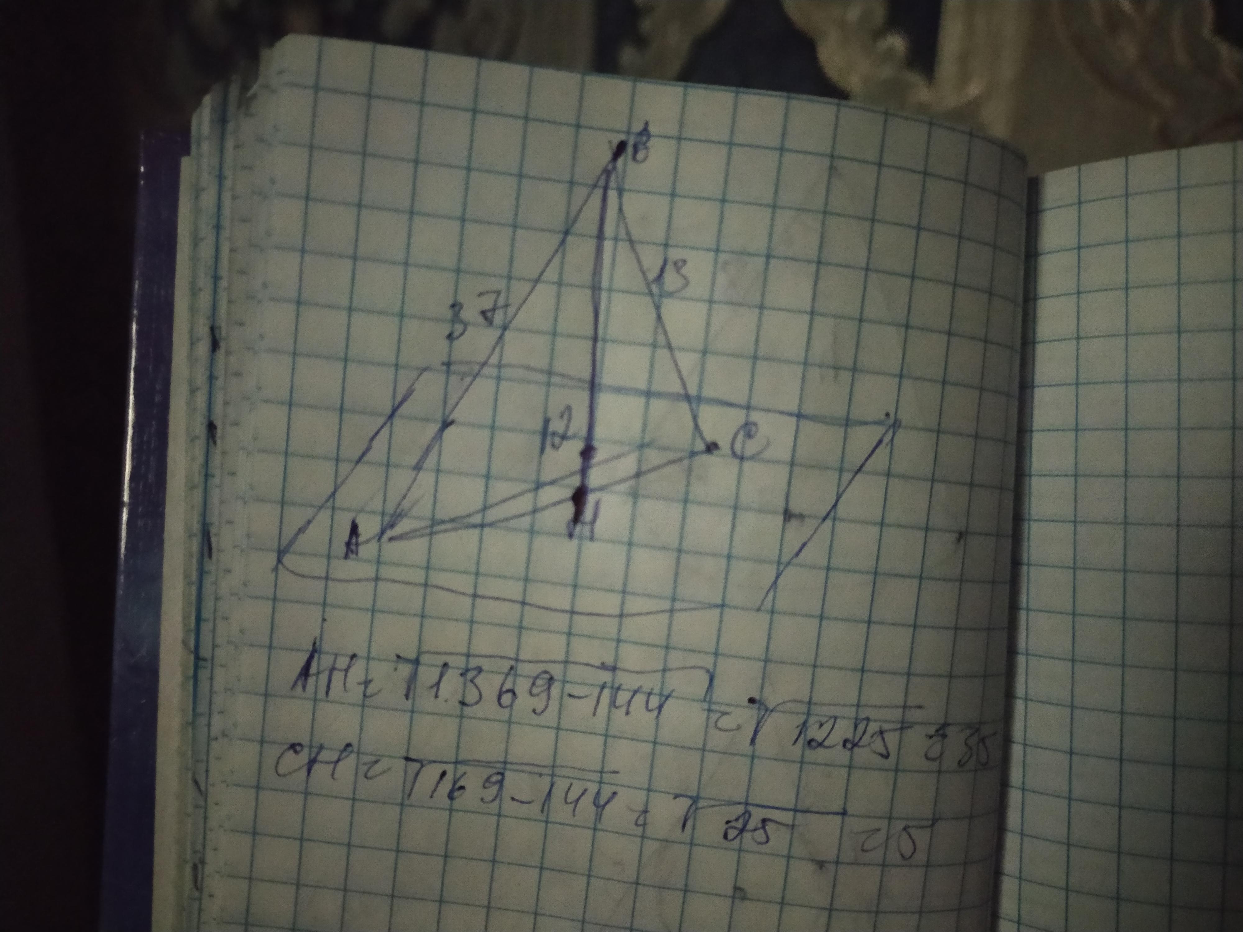 Объяснение: обозначим данные вершины А В С, а расстояние от точки до плоскости ВН. Так как расстоянием от точки к плоскости является перпендикуляр, то ВН перпендикулярно плоскости. У нас получился треугольник АВС с высотой ВН. ВН делит ∆АВС на 2 прямоугольных треугольника АВН и СВН, в которых наклонные АВ и ВС - гипотенуза, а ВН и АН и СН- катеты, причём АН и СН являются проэкция и на плоскость, найдём их по теореме Пифагора: АН²=АВ²-ВН²=37²-12²=