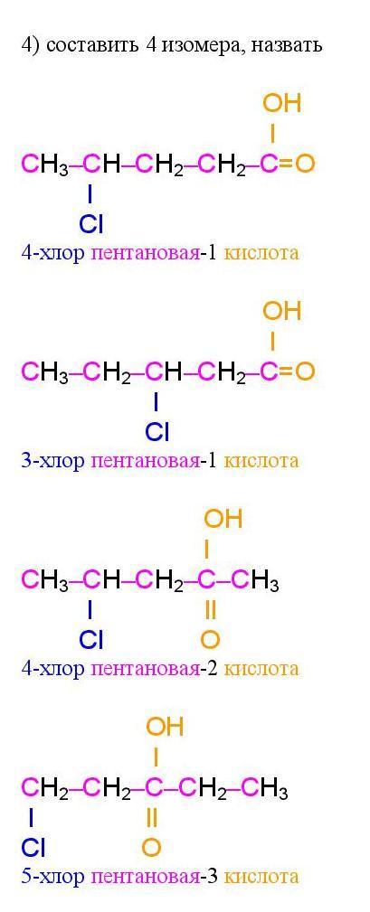 5-хлор пентановая -1 кислота 1) составить структурную формулу 2) составить бруттоформулу 3) составить 3 гомолога, назвать 4) составить 4 изомера, назвать