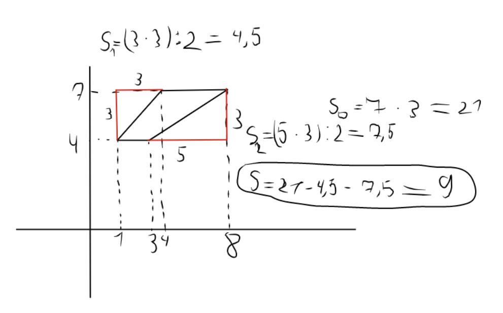 4) вычитаем площадь этих треугольников из общей площади прямоугольника и получаем площадь данной фигуры