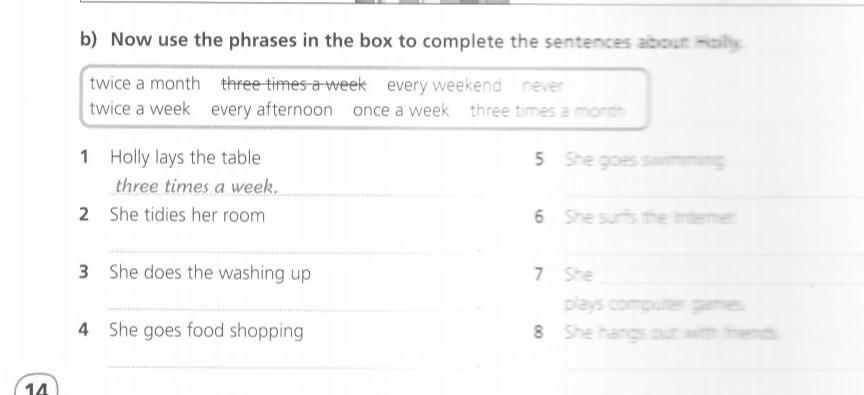 Ответ:2-every weekend 3-once a week 4- twice a week 5- three times a month 6-every afternoon 7-never 8-once a week