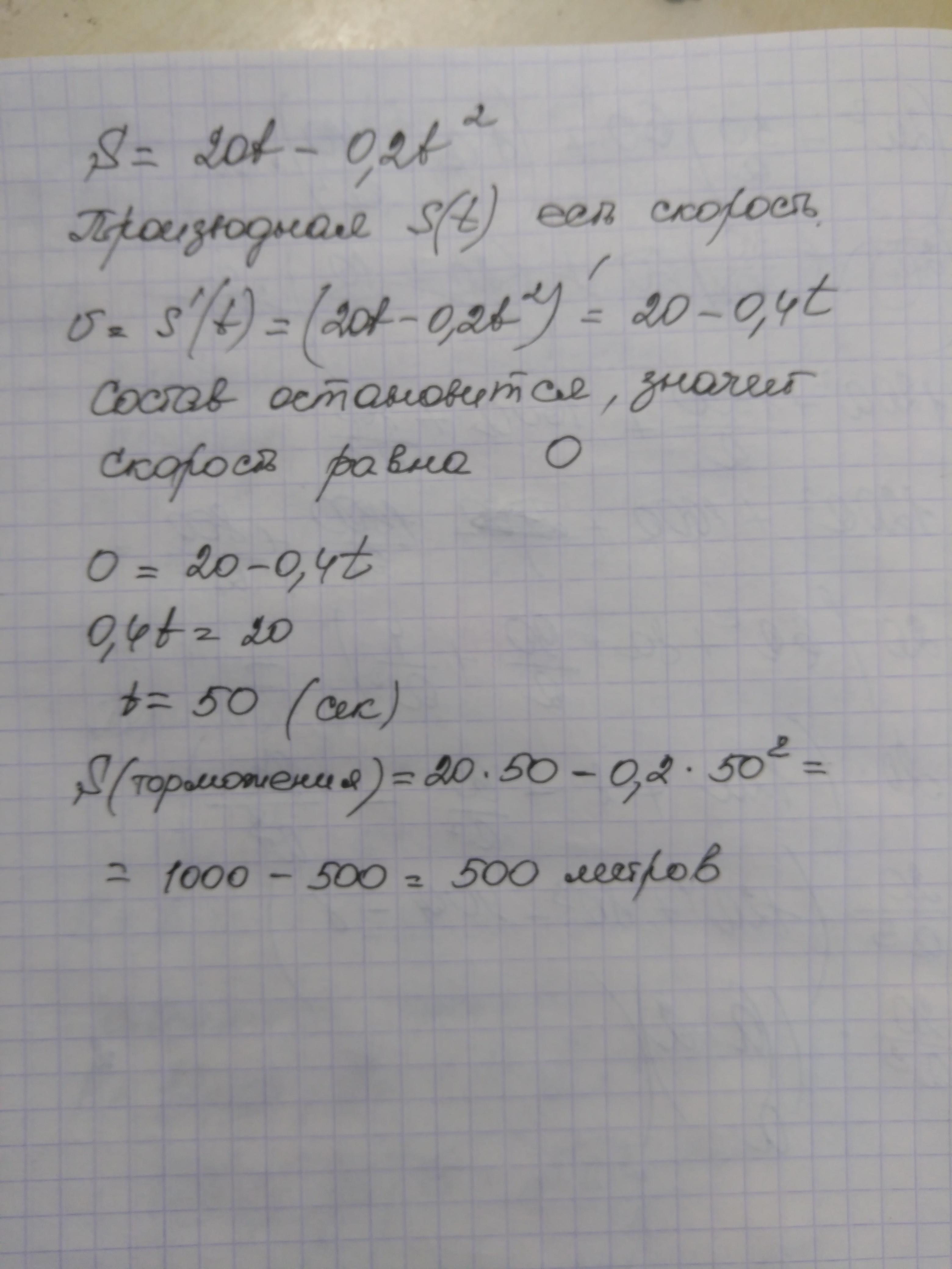 Cостав движется по закону s(t) = 20t – 0,2t 2 (t – время в сек., s – расстояние в метрах). Через сколько секунд после начала торможения состав остановится? Вычислите длину тормозного пути.