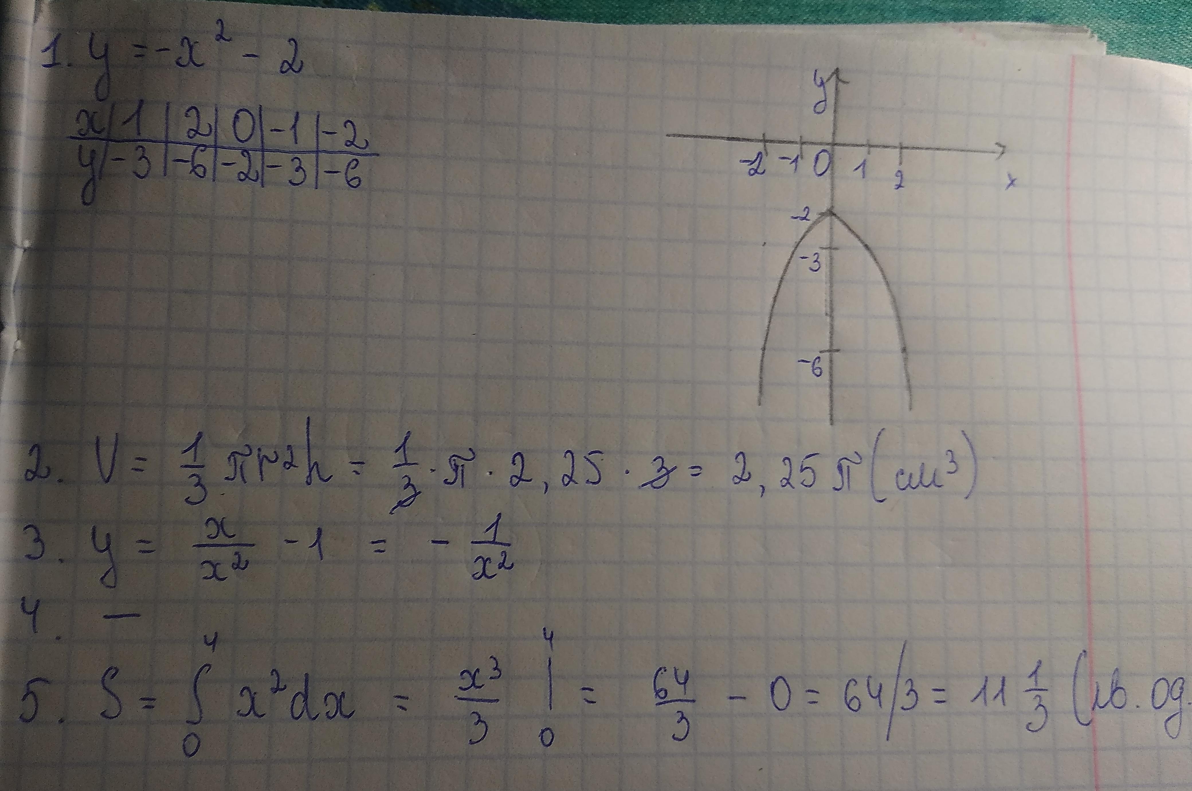 1. построить график функции y=-x^2-2 2. найти объём конуса, высота которого 3см а радиус основания 1.5см 3.вычислить производную функции y=x/x^2-1 4. найти точки перегиба функции y=4x^3-3x^2-36x-10 5. вычислить площадь фигуры, ограниченной линиями y=x^2 y=0 x=0 x=4
