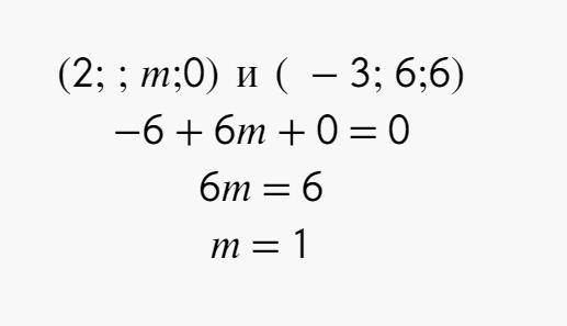 При каком значении m векторы (2; ; m;0) и ( -3; 6;6)перпендикулярны?