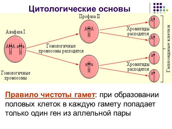 - В процессе образования половых клеток (гамет) происходит мейоз, в результате которого образуются 4 гаплоидные клетки. В процессе первого деления мейоза каждая из пары гомологичных хромосом ( а с ними и аллельные гены) разделяются ( в анафазу 1 мейоза и попадают каждая в одну из образовавшихся клеток.