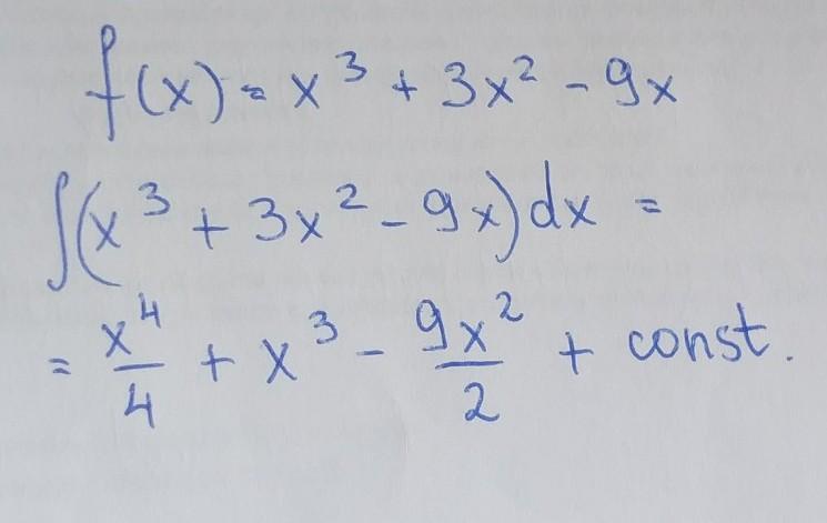 ∫(x³+3x²-9x)dx= ∫x³dx+3∫x²dx-9∫xdx= x⁴/4 + x³- 9x²/2 +C