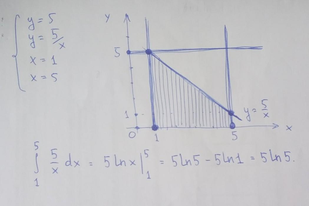 Побудувати графік та найти площу фігури,яка обмежена Наступими функціямі: у=5, y= 5/x, x=1,x=5