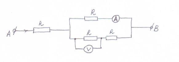 На рисунке представлен участок цепи AB. По нему течет ток силой 9 А. Определить показание амперметра и общее сопротивление цепи, если R=3 Ом.