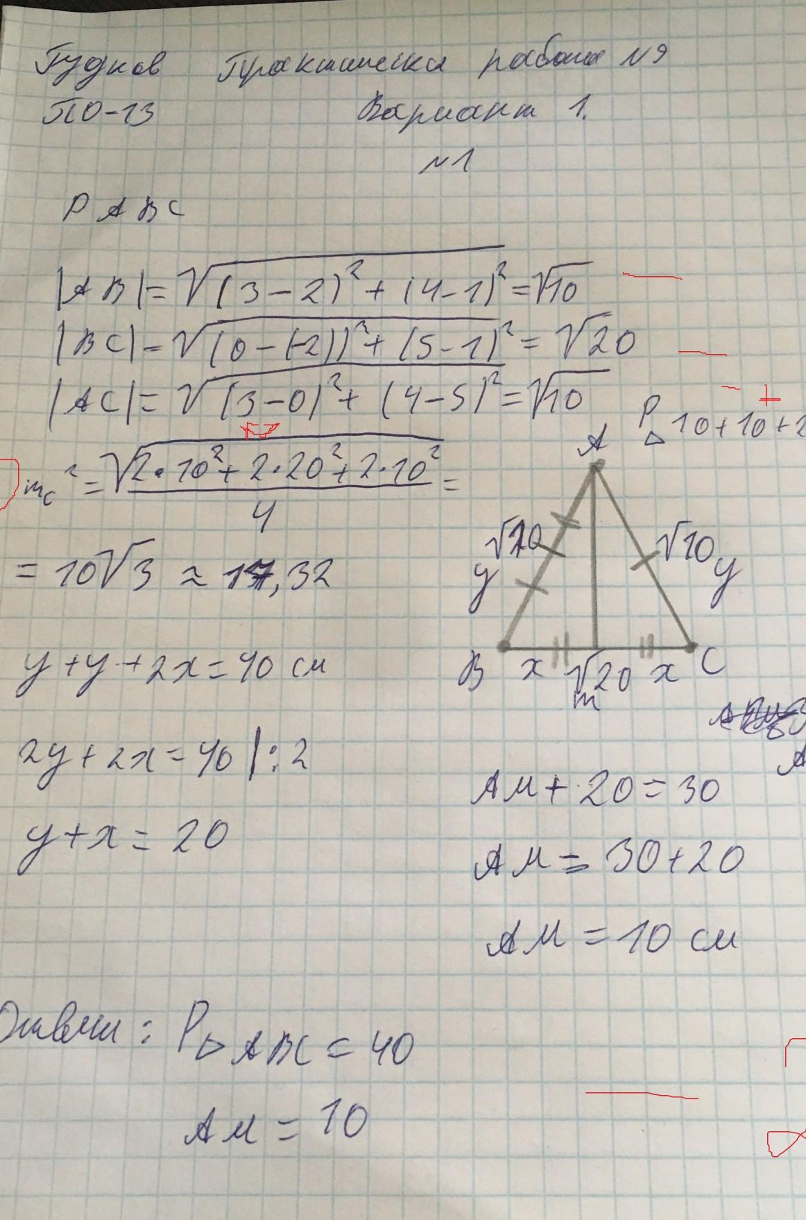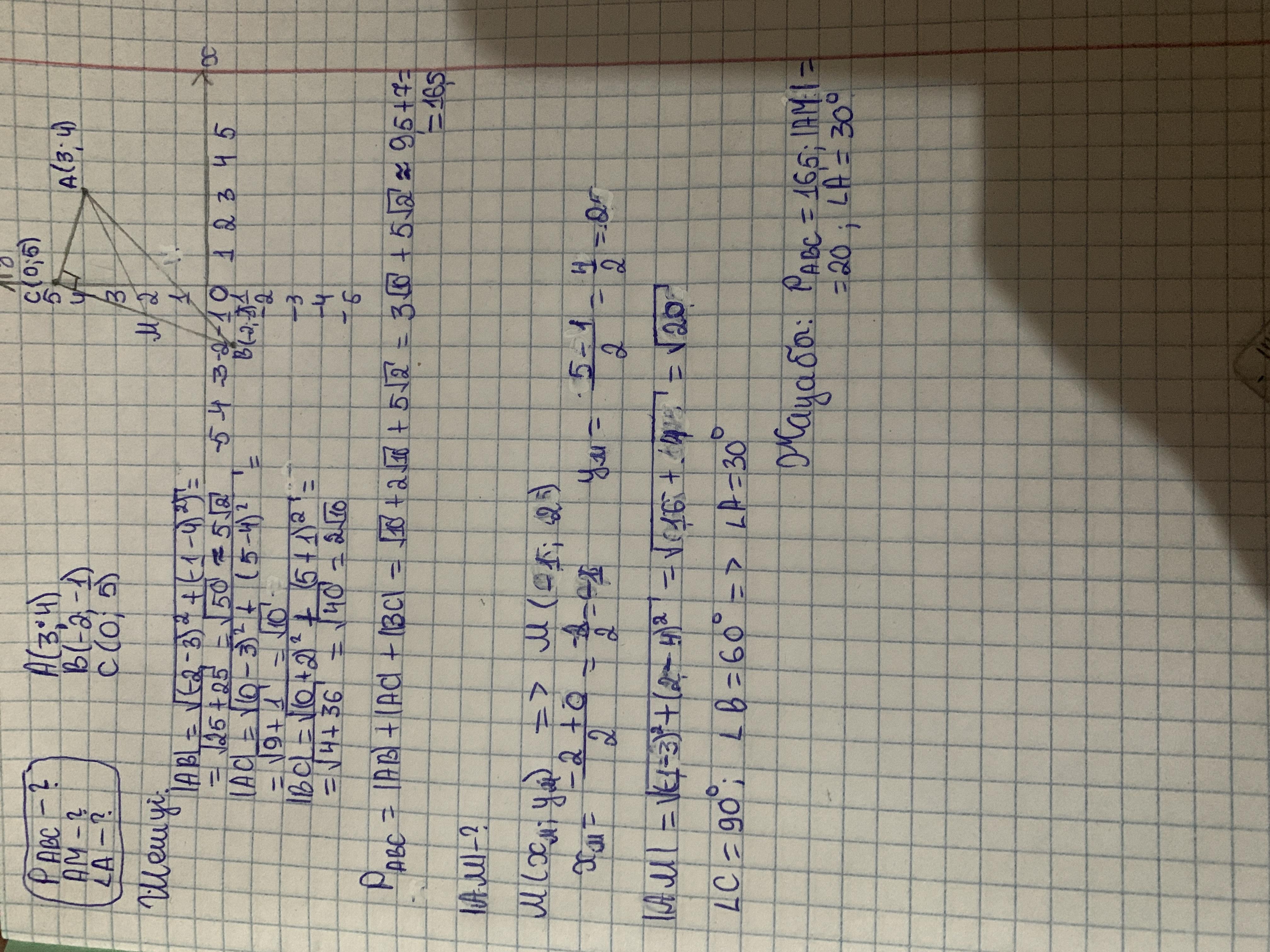 50 баллов!!! Надо исправить В треугольнике ABC A(3;4), B(-2;-1), C(0;5).: Найти периметр треугольника ABC, длину медианыAM , угол A