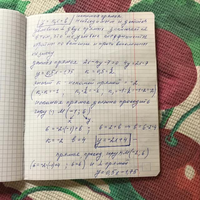 Составьте уравнение прямой, которая проходит через точку М1 (-1; 6) и перпендикулярна прямой 2х - 4у - 7 = 0.
