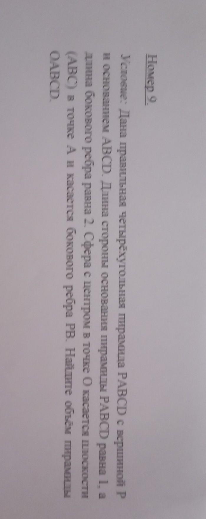 Дана правильная четырехугольная пирамида РABCD c вершиной Р и основанием ABCD. Длина стороны основания пирамиды равна 1, а длина бокового ребра равна 2. Сфера с центром в точке О касается плоскости основания в точке А и касается бокового ребра РВ. Найдите объем пирамиды OABCD.