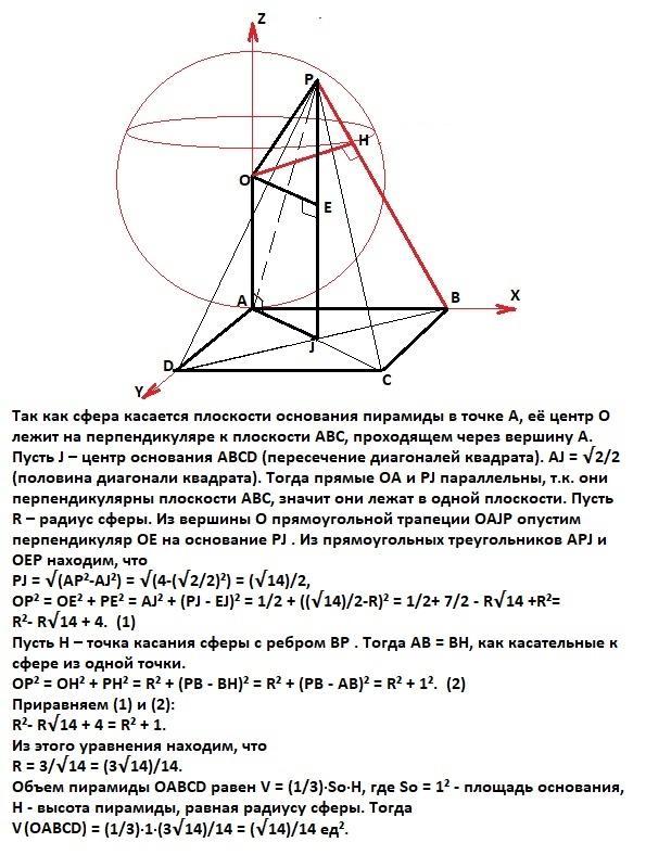 Так как сфера касается плоскости основания пирамиды в точке A, ее центр O лежит на перпендикуляре к плоскости ABC, проходящем через вершину A. Пусть J – центр основания ABCD (пересечение диагоналей квадрата). АJ = √2/2 (половина диагонали квадрата). Тогда прямые OA и PJ параллельны, т.к. они перпендикулярны плоскости ABC, значит они лежат в одной плоскости. Пусть R – радиус сферы. Из вершины O прямоугольной трапеции OAJP опустим перпендикуляр OE на основание PJ . Из прямоугольных треугольников APJ и OEP находим, что