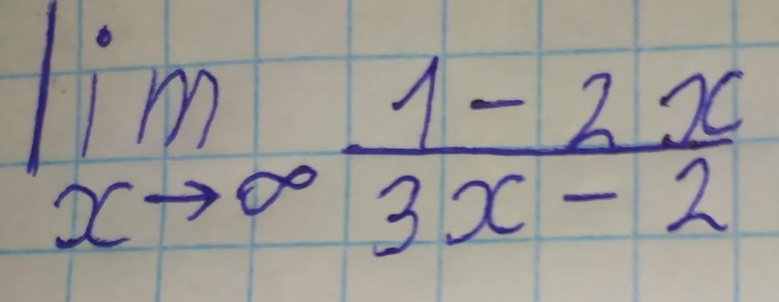 \displaystyle\lim_{x\to\infty}\dfrac{1-2x}{3x-2}=\lim_{x\to\infty}\dfrac{\frac{1}{x}-2}{3-\frac{2}{x}}=\dfrac{0-2}{3-0}=-\dfrac{2}{3}