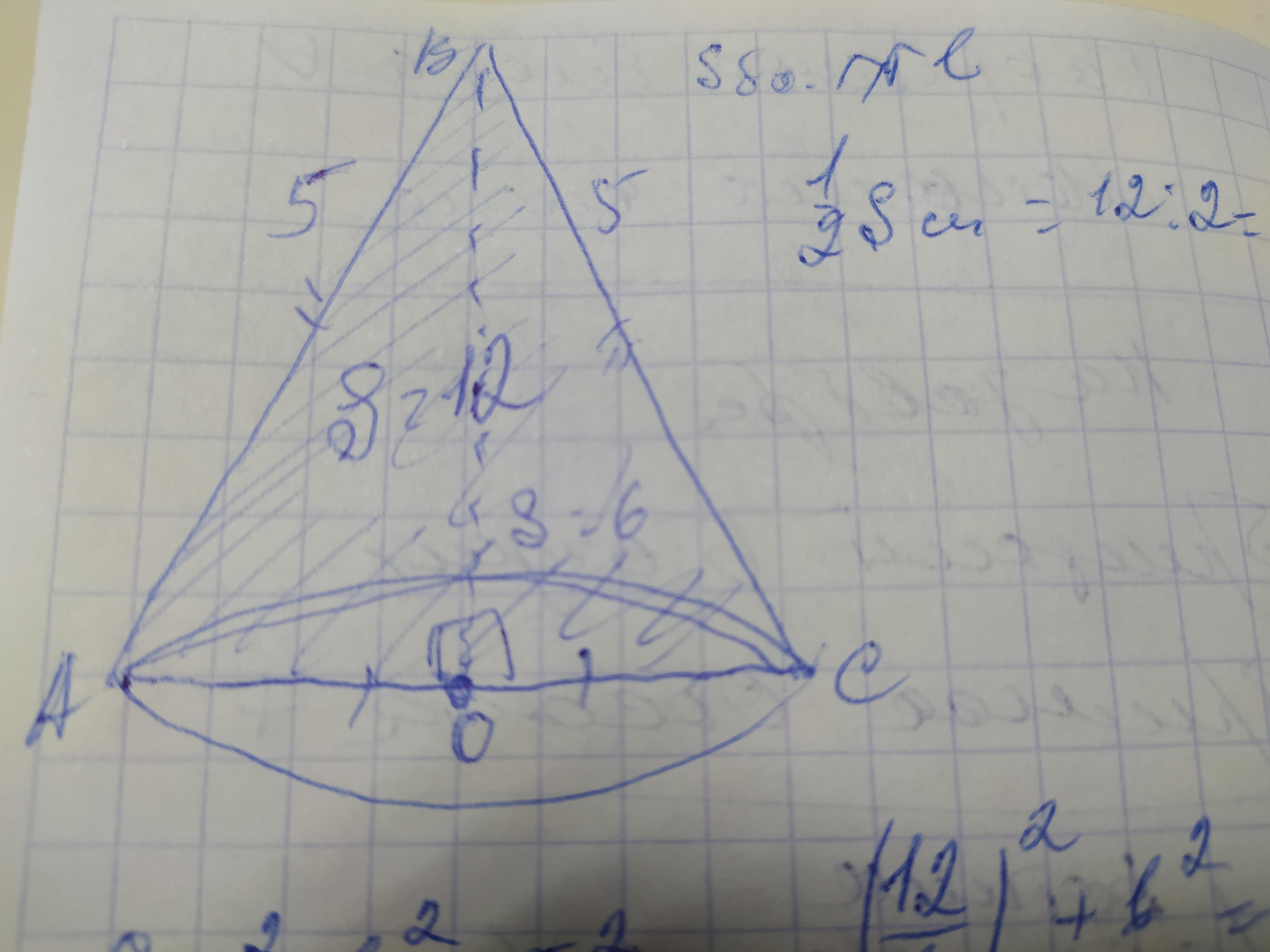 равнобедренный треугольник, поскольку образующие АВ=ВС=5см. Высота ВО делит ∆АВС на 2 равных прямоугольных треугольника в которых АО, СО, ВО- катеты а АВ и ВС гипотенузы. АО=СО=радиусу. Если площадь АВС=12см², то площадь АОС=12/2=6см²