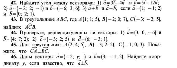 42. 1)(3;0;-4)*(5;0;-12)=15+48=63; Длина вектора а равна √(9+16)=5; вектора b равна √(25+144)=13 ; cosα=63/(5*13)=63/65; α=arccos(63/65)