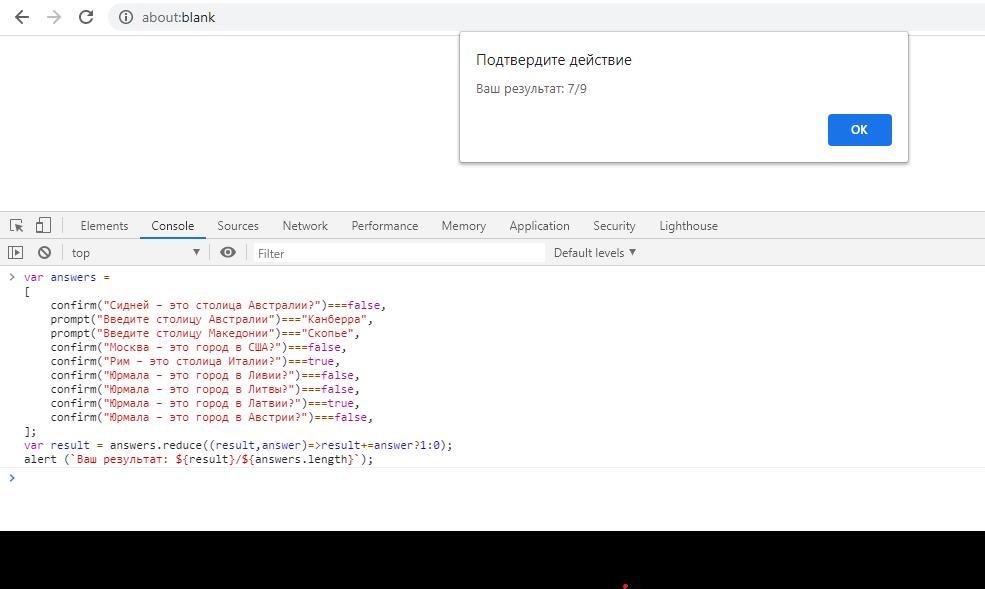 Cоздание теста на знание столиц стран мира. Задание1. С помощью confirm() создайте тест с вопросами о столицах стран мира. Например: «Введите столицу Австралии» или «Сидней – это столица Австралии?». После прохождения теста пользователю должно выводиться сообщение с количеством правильных ответов.