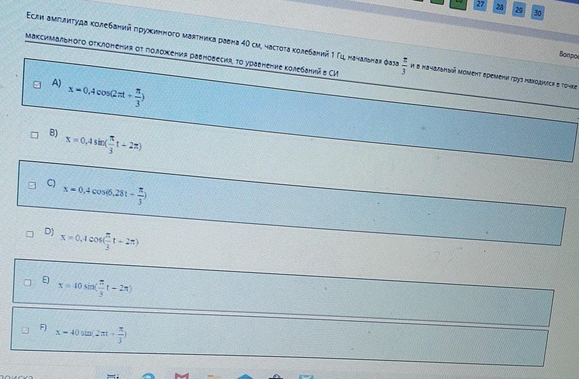 амплитуда 0.4м, угловая частота w=2πf=6.28 1/c, нач. фаза при t=0 π/3, тогда ответы А и С