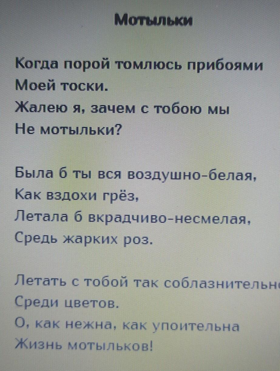 Его мечта сладка и упоительна, окрашена в бело-розовые нежнейшие цвета. Место действия лирический герой выбирает не в жестоком мире, а среди цветов, что очень напоминает райский сад. Именно там, среди "жарких роз", исполнится его заветное жаление: его возлюбленная наконец-то поймёт, как "нежна, как упоительна жизнь мотылька", а её "вкрадивая и несмелая" красота и очарование раскроются с новой силой.