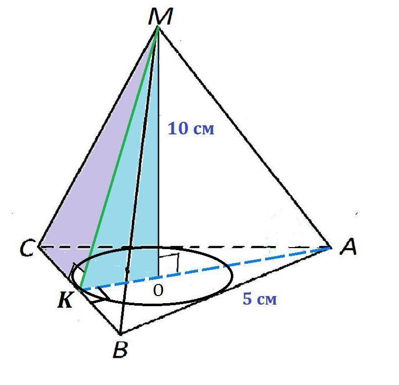MK = √(MO² + KO²) = √(10² + ((5√3)/6)²) = 35/(2√3) = (35√3)/6 см.