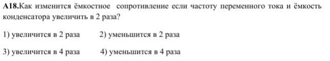 А18. Как изменится ёмкостное сопротивление если частоту переменного тока и ёмкость конденсатора увеличить в 2 раза? 1) увеличится в 2 раза; 2) уменьшится в 2 раза; 3) увеличится в 4 раза; 4) уменьшится в 4 раза.