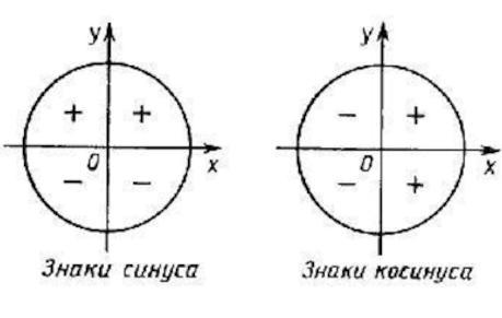 В тригонометрии для определения знака Sin a и Cos a принято использовать окружность. Sin a считается по оси OY, a Cos a считается по оси OX. В случае с Sin, то всё, что выше оси OХ имеет знак плюс, а всё что ниже оси OХ - минус. В случае с cos, то всё, что правее оси OY имеет знак плюс, а всё что левее оси OY - минус. Получается в 1 четверти ( ) и sin, и cos будут положительными.