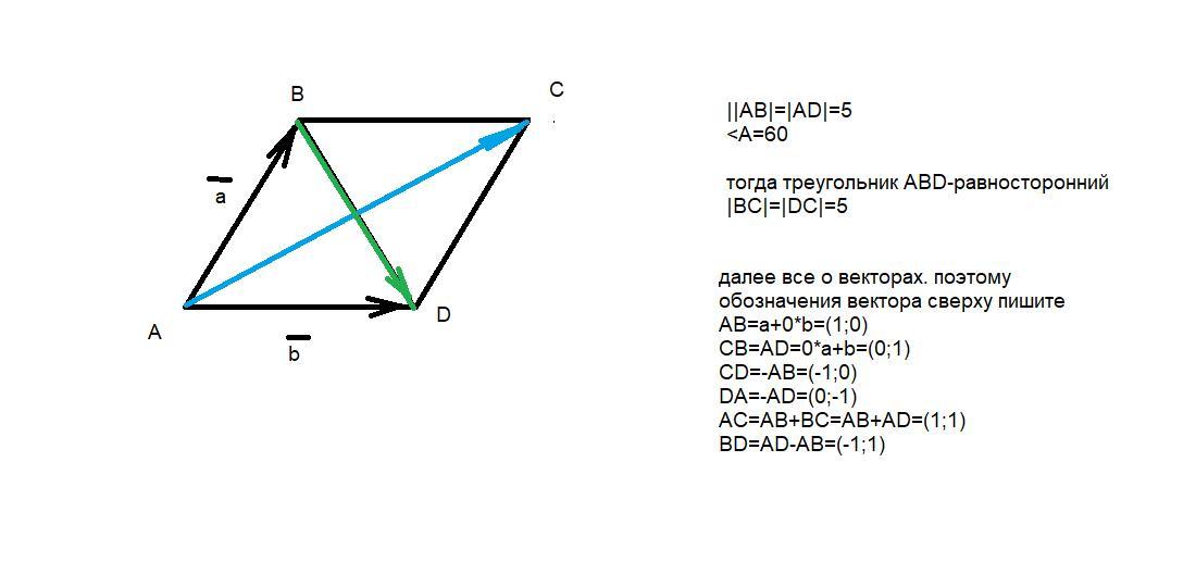Геометрия 100 баллов. Тема: Векторы №1. Постройте вектор х, удовлетворяющий равенству а) x+a-b=2a-3b б) 2x-a+5b+x-c+b+3a №2. Векторы a+2b и 5a-4b перпендикулярны. Какой угол образуют единичные векторы a и b? №3 Дан ромб ABCD, причём AB=5 и угол BAD= 60 градусов. В плоскости ромба выбран базис (a;b) такой, что вектор AB = a и вектор AD = b. Найдите в этом базисе координаты векторов AB, BC, CD, DA, AC, BD.