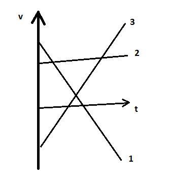 На рис. - график зависимости движения трех тел. Кaкoй гpaфик cooтвeтcтвует равнозaмeдлeннoмy движению?