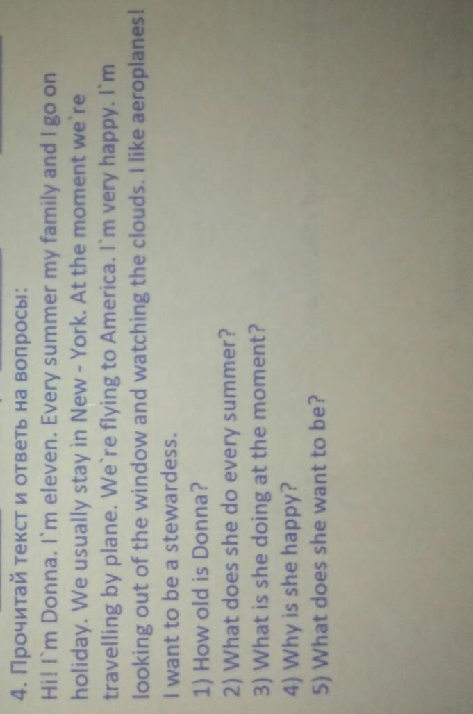 3) At the moment she's traveling by plane to America. She is looking out of the window and watching the clouds.