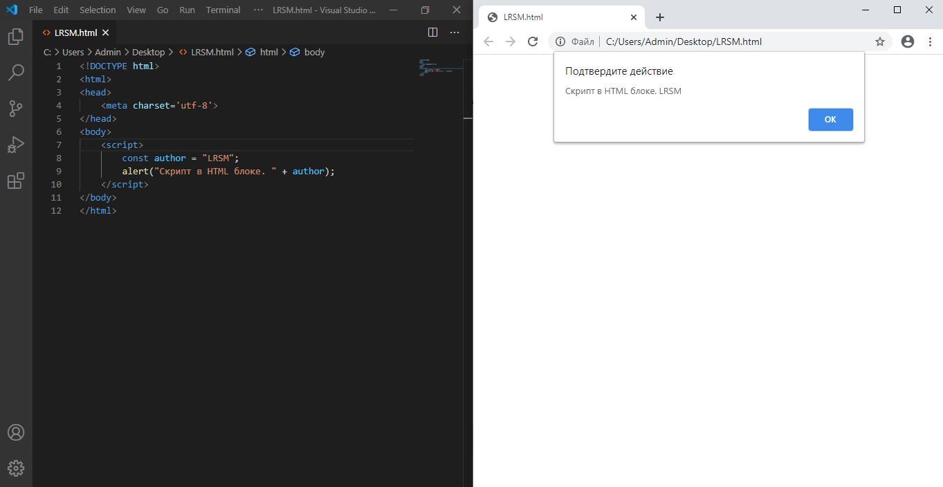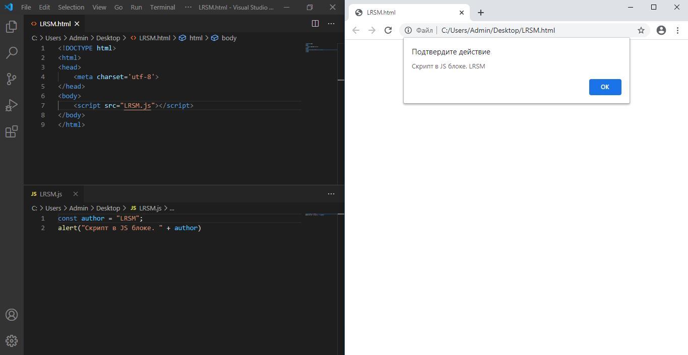 Домашнее задание. Cоздание двух проектов. Задание1. Cоздайте две веб-страницы. Для первой страницы подключите скрипт в HTML блок, для второй — вынесите скрипт в блок JS. С помощью скрипта выведите сообщения через функцию alert о типе подключения скрипта и авторе работы. Для хранения информации об авторе используйте переменные. Это джава скрипт